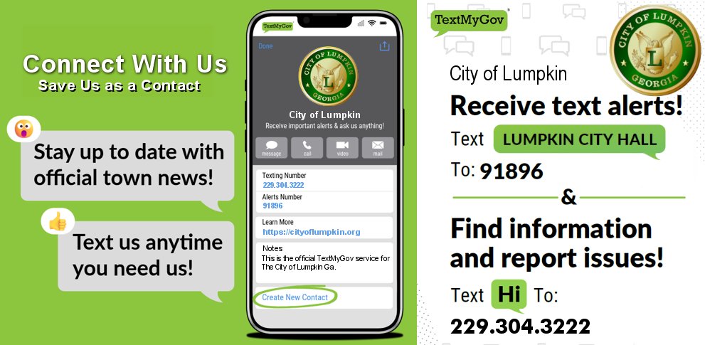 The City of Lumpkin is committed to strengthening communication with our residents and ensuring that information and services are always at hand. We are excited to introduce TextMyGov, a convenient new tool that allows residents of Lumpkin, and visitors to connect with City Hall via simple text messaging.